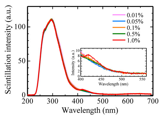 The scintillation spectra of the Li-doped CaF2 ceramics are displayed in Figure 6. It can be observed that scintillation peaks were consistently observed at around 300 nm in all the samples. This is in line with previous research [46], and the origin of this is self-trapped exciton. In addition, an emission peak at 420 nm was only observed in the 1.0% Li-doped CaF2 ceramic. The origin of this peak remains unclear; however, a similar peak has been reported in the previous study as well [47].