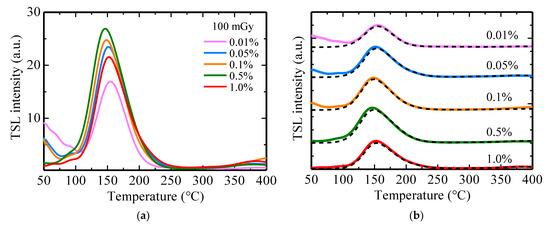 (a) TSL glow curves of the Li-doped CaF2 ceramics. The heating rate was fixed to 1 °C/s. (b) Comparison of the TSL glow curves immediately after ionizing irradiation and 24 h later. The black dashed lines show each glow curve 24 h later.