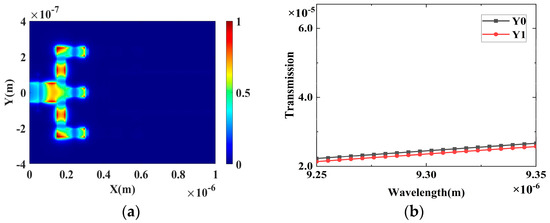 The proposed optoelectronic 4 × 2 encoder was simulated using the three-dimensional finite-dimensional time-domain difference (FDTD) method from Lumerical Solutions Canada, version 2020 R2. Compared to the spectral element method (SEM) [62], which focuses more on the mechanism, FDTD is more convenient for visualizing the electric field intensity distribution of the proposed structure. In the simulation, the grid size in the z-direction around the graphene layer is fixed at 0.1 nm and gradually increases outside the graphene layer. In addition, the grid sizes in the x and y directions are set to 8 nm and 4 nm, respectively. In addition, a perfectly matched layer (PML) boundary condition is used in the simulation. The structure is also excited by TM mode light waves with a wavelength of 9.3 μm and a bandwidth of 0.1 μm. Figure 7 shows the intensity of the electric field distribution for different encoding states. Different external voltages are applied to the plasma switches on the optical waveguide branches according to the selective contacts to characterize the four-bit code. The applied external voltage is 1 ev in the branch where the graphene plasma switch is located, and then I1, I2, and I3 are in the “ON” state and are defined as code “1”. Similarly, the applied external voltage is 0.1 ev in the branch where the graphene plasma switch is located, and the branch where I1, I2, and I3 are located is “OFF” and is defined as code “0”. In this way, when the plasma switch on the waveguide branch is coded “1”, the optical signal can be passed through the waveguide branch. According to the working principle of Section 3 and the true value of Table 2, the coding function of 4 × 2 is realized. As shown in Figure 7a, when I1, I2, and I3 are “OFF”, the default I0 is “ON”, and the four-bit coding flag is defined as “1000 “(I0 I1 I2 I3 I4). As there are no light signals in the output of Y0 and Y1, the 2-bit outputs is are“00” (Y0Y1). Figure 7c is the electric field intensity distribution, when only I1 is “ON”. Figure 7e is the electric field intensity distribution, when only I2 is “ON”. Figure 7g is the electric field intensity distribution, when only I3 is “ON”. Table 3 summarizes the normalized transmission under different coding conditions, which leads to two important parameters for the evaluation of the encoder.