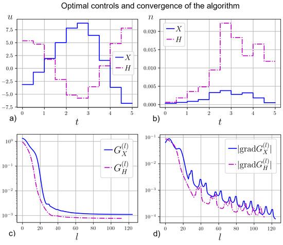 Optimized coherent control (subplot a) and incoherent control (subplot b) which generate the quantum gate X (blue line) and the Hadamard quantum gate H (purple line); convergence of the fidelity—the objective functional (33)—(subplot c); norm of the gradient of the objective functional (subplot d) vs. number l of the optimization algorithm (31) iterations.