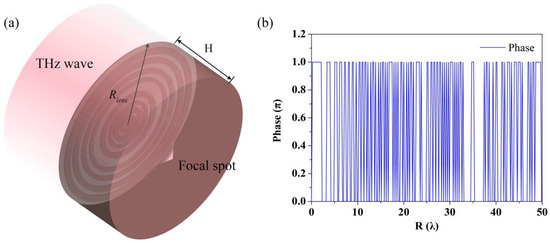 The solid immersion lens optimized based on a super–oscillation for circularly polarized light is illustrated in Figure 1. Since the proposed metalens is planned to be applied in subsequent studies and the FIRL100 laser (Edinburgh Instruments Ltd., Edinburgh, UK) is available in the laboratory, its corresponding wavelength of 118.8 μm is chosen. Figure 1a shows the schematic diagram of the principle of operation of the solid immersion lens. The beam is focused in a dielectric column after passing through a super–oscillating phase mask and emitted into the air. The wavelength of the plane wave in the dielectric column theoretically equal to 1/n times that in air, as is the volume of the evanescent field behind it [26]. Therefore, at a small distance from the flat surface of the truncated silicon column, we can obtain a smaller terahertz beam. Rlens represents the radius of the solid immersion lens and H is the thickness of the dielectric column. High–resistance silicon was chosen as the material of the solid immersion lens because of its high refractive index and low absorption in the THz band.