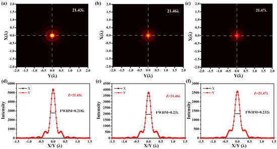 The intensity obtained by FDTD in the focal plane at z = 21.43 λ (a), 21.46 λ (b), and 21.47 λ (c), respectively. The intensity curves obtained by FDTD at z = 21.43 λ (d), 21.46 λ (e), and 21.47 λ (f) on the x–axis and y–axis.
