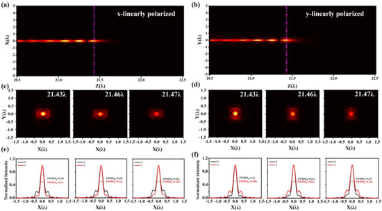 Since the linearly polarized wave is the superposition of the left– and right–circular polarized components described above, the as–designed solid immersion lens is also suitable for linearly polarized light. The focusing performance of the lens with x–polarized light and y–polarized light is shown in Figure 5. Figure 5a,b show the optical intensity distribution along the propagation plane under x–polarized and y–polarized incidence, respectively. They are consistent with the distribution trend of optical intensity under circularly polarized light. Figure 5c,d give the two–dimensional light intensity distribution on the focal plane at positions z = 21.43 λ, 21.46 λ, and 21.47 λ in air. As can be seen from the figures, the focused spots have distinct side lobes in the direction that coincides with the polarization. The corresponding intensity curves in x– and y– directions are presented in Figure 5e,f, and the corresponding parameters are listed in Table 1. The FWHMs in x–direction at z = 21.43 λ, 21.46 λ, and 21.47 λ are 0.24 λ, 0.25 λ, and 0.25 λ, respectively, which are slightly larger than the FWHM at the circular incidence. Additionally, the values in y–direction are 0.2 λ, 0.23 λ, and 0.232 λ, respectively, which are close to the FWHM at circular polarization. The FWHM in the x–direction is slightly larger than that in the y–direction, but it is still less than 0.25 λ. The side–lobe ratio of the x–axis is approximately three times that of the y–axis, 20.57% and 6.70%, 22% and 7.87%, and 24.19% and 9.50%, respectively. The same phenomenon occurs when the incident light is y–polarized, the direction with the larger side lobe of the focal spot is changed to the y direction. This result proves that we can use y–polarization or x–polarization in subsequent applications without polarization conversion, which further simplifies the application steps.