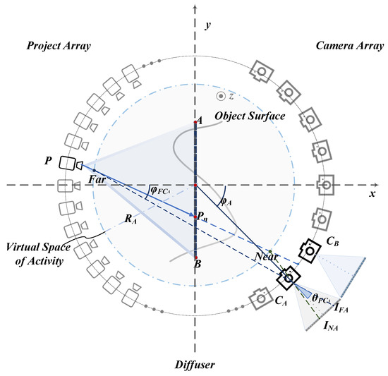 To reduce the computational redundancy, the algorithm first establishes a virtual activity space, which is a cylinder space with a sufficiently large radius, and the space can contain all of the light-field information of the real scene. As shown in Figure 4, this figure is the top view of the system structure at the height of the projector array, the blue area with a radius is the virtual activity space. intersects the boundary of the active space at two points, which are recorded as the near field point, , and far field point, according to the distance between these two points and the camera’s orbit.