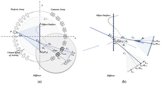 The SPOC algorithm has become mature after a long-period of development, but it still needs to be appropriately modified when it is applied to the MPTLFD system for coding. The corresponding mapping relationship is modified according to the actual light path, and the algorithm is improved to adapt to the capture and reconstruction parameters of the system. The principle of the improved algorithm applied to the system is shown in Figure 2, which is the top view of the system section at the height of the projector array. The projector array and the capture camera array are arranged in concentric arcs and their configuration are shown in Figure 1a. The camera parameters in the capture space and the projector parameters in the projector array are consistent. Line segment in Figure 2 represents the top view of the diffuser.