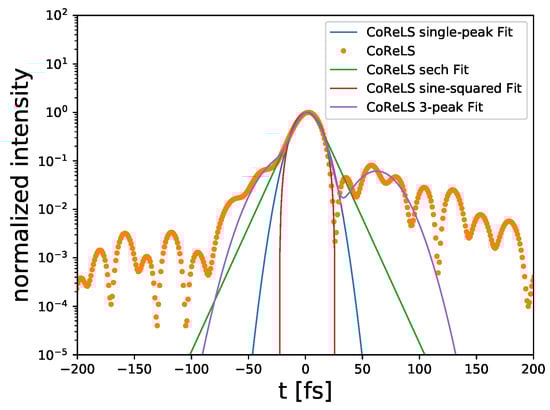 Although Gaussian profiles are formally inconsistent with Maxwell’s equations, they remain useful because measured laser pulse profiles are often fit passably by Gaussians and not often fit by hyperbolic secant functions. Further, several ultra-high-intensity systems have observed multiple peaks in the temporal profile. In Figure 2, we fit a single Gaussian, a three-peak Gaussian, a hyperbolic secant function and sine-squared function to the temporal profile of the 4PW Ti:Sapphire laser system at the Center for Relativistic Laser Science (CoReLS) in Gwangju, Korea. The central peak is best fit by a Gaussian, but a model with more degrees of freedom incorporates relevant features at ∼10% peak intensity. The three-peak fit loses information, but we have found that the additional features visible in the measured profile have a small effect on the accelerated electron distribution compared to the main peaks. The early-time features at less than the peak intensity effect small changes to the energy gain as long as they correspond to . This reasoning would not hold for peak , such as achieved for f/1 focusing on many petawatt-class systems. The late-time features generally have a negligible effect on the electron energies, because the electrons have been ponderomotively ejected from the focal region before these features catch up.