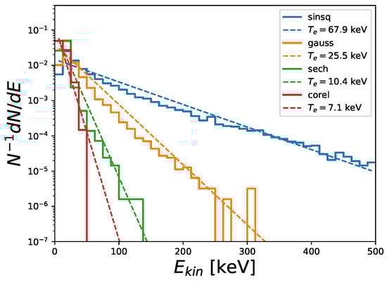 Figure 3 compares the final energy distribution of electrons accelerated by four different temporal profiles, including sine-squared and the recommended hyperbolic secant. The laser has peak intensity corresponding to , focal spot radius m, and full-width half-max duration (measured on intensity) of fs. The electrons are initially zero temperature with initial velocity parallel to the laser propagation axis, , corresponding to kinetic energy keV. The electrons are initially uniformly distributed in a cubic 3-dimensional volume around the focal spot within of the beam axis. Increasing the volume covered by electron initial positions would result in more electrons receiving small or negligible acceleration and thereby increase the weight of around the initial kinetic energy without significantly affecting the fit at higher energies.