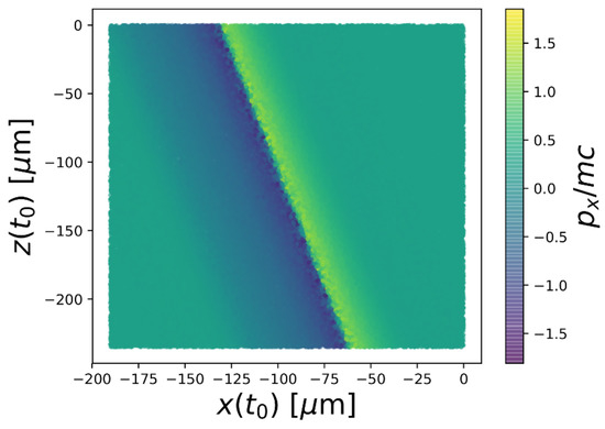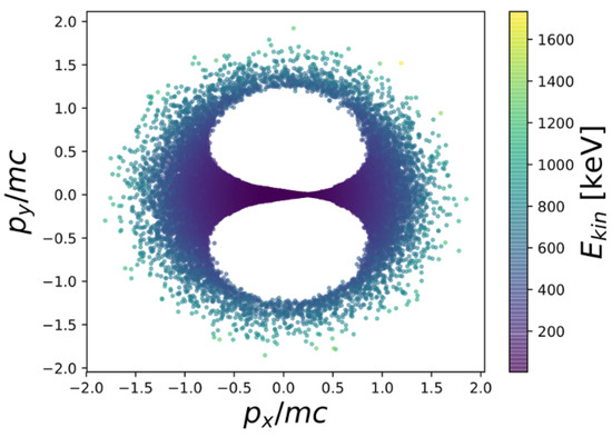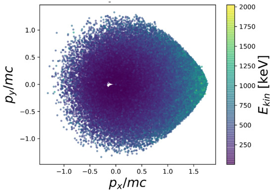 Figure 4 shows the distribution of final transverse momentum for , which is chosen among many possible values of that can yield electrons with kinetic energy up to ≃900 keV. Notice that the distribution is not azimuthally symmetric with additional higher momenta in the direction, corresponding to particles that first enter the laser field near the focal spot where the laser fields are maximum. As shown by the color-coding these particles also achieve the highest energy, consistent with our reasoning. This effect is particularly large for photo-ionized electrons, which begin free propagation when the peak laser field is in focal region [33]. The anisotropy arises from the maximum of the E field coinciding with the peak of the profile due to the specific value of the carrier–envelope phase in our model of the fields.