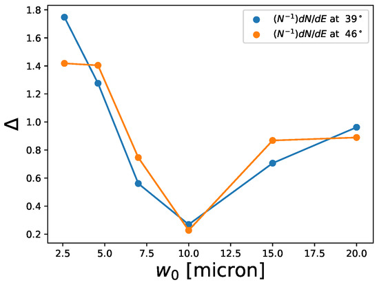 The error functional Equation (10) along two sight lines, 39 and 46 from the beam axis for a 20 J, 367 fs laser pulse for varying waist size .