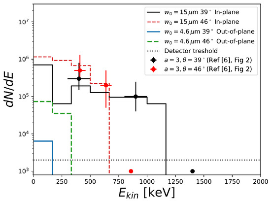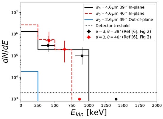 In the second fit, Figure 9, we follow the same procedure, choosing the laser parameters and initial transverse momentum to fit the in-plane measurements of and then varying the spot size to reproduce the relative suppression of out-of-plane electron number. In this case, we use a sine-squared temporal profile, which yields higher energy electrons without any sudden turn-on (recall Figure 3). Computing for the in-plane and out-of-plane measurements, we obtain 1.98 and 1.87 at and , respectively, showing how the functional signifies a nearly 0 or 1 difference in signal.