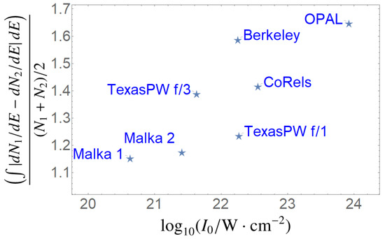 which compares for two sets () of laser and plasma initial conditions and outputs a number. The error Equation (10) could be experimentally measured, provided a laser system with sufficiently precise control to run statistically distinct experiments at the parameter sets (1) and (2), in which case the average and the standard deviation of the spectrum could be obtained over shots at a given parameter set. Equation (10) can be thought of as the simplest metric on the abstract space of spectra, though it is neither a standard measure of error nor a prediction interval. For the present it provides an intuitive measure of the difference between a predicted electron spectrum and a measured result in case of few shots where a proper average cannot be constructed.