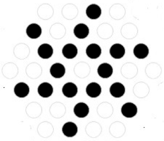The cross-section schematic of the proposed spiral shaped photonic crystal fiber based surface plasmon resonance biosensor is shown in Figure 1. The sensor design is based on a PCF made up of silica (SiO2) with circular air holes in spiral shaped cladding. This structure can be realized by stacking the silica capillaries (shown as black circles) and rods (shown as white circles) in a conventional hexagonal lattice, as shown in Figure 2. This stack can then be drawn into a fiber using the stack-and-draw technique. Such a hexagonal lattice-based design of the spiral PCF has been recently fabricated [37]. The distance between any two air holes pitch Λ is 2.3 µm, and the hole diameter d is 1 µm. To construct a solid core for light confinement, one air hole is removed from the first layer of hexagonal lattice. This configuration is suitable for producing surface plasmons. A 25 nm thick gold film is deposited over the PCF as a plasmonic material for effective sensing. This can be implemented using the chemical vapor deposition (CVD) process. A 2.6 µm cancer cell identification layer is placed above the plasmonic layer. Finally, to shield the PCF’s interior structure from outer air disturbances, a “perfectly matched layer (PML)” of thickness 0.3 µm is placed above the cancer cell detecting layer. The Sellmeier Equation (1) used for calculating RI of silica is as follows [38]: