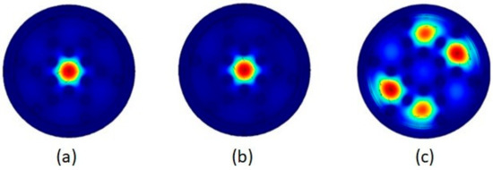 ΩL = 650.07 2π THz (Lorentz oscillator strength) and = 104.86 × 2π THz (Spectral width). The modal analysis of the proposed PCF design was carried out with COMSOL Multiphysics 5.3 employing the Full-Vectorial Finite Element Method (FV-FEM) with perfectly matched layers (PML). Figure 3a–c shows electric fields in X-polarized, Y-polarized fundamental and SPP modes, respectively.