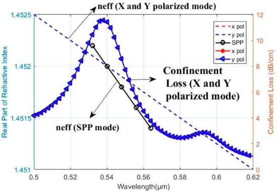 Figure 4 shows the resonance condition for the Jurkat (cancerous) cell. At 540 nm wavelength, the intersections of the efficient indices of the fundamental core mode (blue-dotted) and plasmon mode (black line) can be seen. At that wavelength, the propagation losses are at their peak due to the high-energy transfer from the fundamental core mode to the plasmon mode [50,51,52]. This is confirmation of the occurrence of a resonance phenomenon. Here, the values for the X-polarized fundamental mode and Y-polarized fundamental modes are the same, so the graph overlaps in both modes.