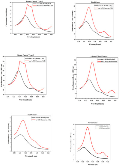 Confinement loss properties of the proposed PCF-SPR biosensor for different kinds of normal and malignant cells.