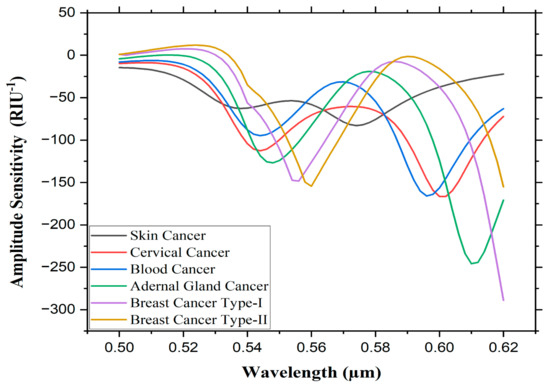 Equations (4) and (5) are employed to calculate the proposed biosensor’s resolution and amplitude sensitivity, respectively. The highest amplitude sensitivity value is obtained as −289 RIU−1 for Breast Cancer (Type-1) (MDA-MB-231 cell) with 2 × 10−5 RIU resolution value as shown in Figure 6.