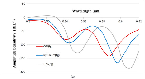 In order to proof the fabrication feasibility of the proposed design, a tolerance study [53] is made, as shown Figure 7. Figure 7 shows the sensor’s Amplitude sensitivity also varies within a tolerance of ±5% of the tg (gold layer) and d (air hole diameter) compared to that obtained using the optimized value of tg and d. It may be seen from Figure 7 that within a tolerance of ±5%, a slight shift occurs in the resonance wavelengths of the optimized parameters.