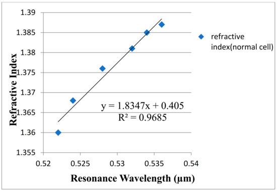 The linearity response is an important aspect of sensor design. For sensor applications, a high linearity response is a desirable metric to evaluate sensor performance. The linear fitting curve for the resonance wavelengths (for healthy cell) and for analyte refractive index ranging from 1.36 to 1.39 is shown in Figure 8. For such a Y-polarized fundamental mode, Equation (6) gives the relevant linear fitting model. The slope of this equation is used to compute the average sensitivity for various refractive index values. R2 is used to determine the sensor’s linear response. A high R2 value (0.9685) is estimated for the suggested biosensor, as shown in Figure 8. As a result, the presented biosensor has a satisfactory linear sensing response, indicating that the sensor design has significant potential.