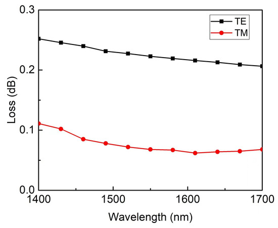 Figure 5 shows the influence of wavelength on coupling efficiency for TM mode and TE mode, respectively. For TM mode or TE mode, the variation of the coupling loss did not exceed 0.1 dB when the wavelength was varied from 1400 nm to 1700 nm. The coupling loss decreased with increases in the wavelength. Since this structure is optimal for TM mode at 1550 nm, the mode field for the TE mode was slightly smaller than that of SMF-28. Thus, as the wavelength increased, the mode field of the TE mode increased, and the loss decreased. For the TM mode, the loss was almost constant. For the TM mode, sub-0.1 dB coupling loss was observed from 1400 nm to 1700 nm, covering the entire S to U bands. Therefore, this structure exhibited a high operation bandwidth with low coupling loss. The structure also had a PDL (polarization-dependent loss) of only 0.14 dB, comparable to the best value reported so far [17].