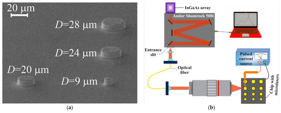 Microdisk cavities were formed from the laser heterostructure by photolithography and plasma-chemical etching. The microlasers are about 28, 24, 20 or 9 µm in diameter and about 6 µm in height. According to our estimates, the effective volume of the WGM varied from 35 to 8 μm3 for resonators with a diameter within the specified range. Round-shaped metal contacts to the p+-GaAs layer were formed at the tops of the microcavities using AgMn/Ni/Au metallization. A solid AuGe/Ni/Au metal n-contact was deposited to the back side of the preliminarily thinned substrate. A scanning electron microscopy image of representative microdisks is depicted in Figure 1a. Chips with several microdisk lasers were soldered with indium to a copper heatsink, which was also used for electrical connection to the n-contact of the microlasers. A BeCu microprobe was used for individual connection to p-contact of separate microdisks.