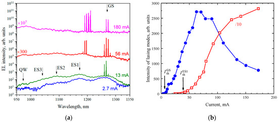 It is also worth mentioning that the two-state (GS-ES1) lasing effect is pronounced in the edge-emitting lasers with the cavity lengths close to the critical one, LES1 or LES2. As an example, Figure 5b demonstrates emission spectra measured at different injections for the 425 µm long laser. The ES1 emission appears already at a current of 1.15 A (2.71 kA/cm2), i.e., very close to the GS lasing threshold, which is 0.85 A (2 kA/cm2).
