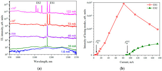 A slightly different situation is observed for the microdisk laser of the smallest diameter of 9 µm, where lasing first starts at the ES1 optical transition (Figure 3a, IthES1 ≈ 6 mA), and the GS laser emission is not observed at all. This indicates that the total optical loss, whatever its cause, in this small cavity exceeds the saturated gain achievable at the GS optical transition. Due to the higher degeneracy of the ES1 quantum level compared to the GS one, the optical gain at the ES1 optical transition turns out to be large enough to compensate the loss. It is seen that an increase in the injection current above the lasing threshold leads to an increase in the integrated intensity of the ES1 laser emission (Figure 3b). Once the current exceeds 90 mA (IthES2), the emergence of an additional blue-shifted lasing line is observed in the electroluminescence spectrum. This line (group of lines) is within the ES2 optical transition, so the two-state lasing effect in the 9 µm microdisk represents a combination of the ES1 and ES2 laser emission. Beyond the two-state lasing threshold, the intensity of the ES2 emission increases, while the intensity of the ES1 laser emission diminishes.