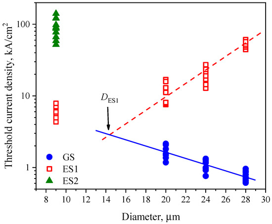 Meanwhile, the current density for the onset of ES1 lasing, JthES1, decreases. This can be attributed to the fact that higher optical loss in smaller cavities causes higher charge carrier concentrations to occupy all excited-state quantum levels, including the ES1 one, which facilitates earlier lasing through the ES1 optical transition. This can be explained in terms of the Pauli blocking, which slows down the carrier relaxation rate from the ES1 level to the GS one when the latter is partly occupied [32]. Thus, the current density interval between JthGS and JthES1, where pure GS-lasing occurs, shrinks as the diameter gets smaller up to complete collapse at a certain critical diameter DES1. Once the microdisk becomes smaller than DES1, no GS lasing can be observed, and the first lasing threshold represents the onset of ES1-lasing, as discussed for the 9 µm microdisk. According to the extrapolation of the experimental data presented in Figure 4, the critical diameter is about 14 µm (at room temperature).