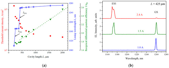 The measured lasing wavelength, threshold current density, and differential quantum efficiency of the broad-area lasers are presented in Figure 5a against the cavity length. It was found that the critical cavity length, LES1, at which lasing begins at the ES1 optical transition and GS lasing disappears, is approximately 0.4 mm. It falls within the interval from 425 to 375 µm, where the lasing wavelength λ drops from 1259 nm (GS) to 1172 nm (ES1), respectively. For even shorter laser cavities, one more jump in the lasing wavelength down to 1099 nm is observed. This wavelength corresponds to the ES2 optical transition, and the critical cavity length, LES2, falls in the range from 250 to 200 µm.