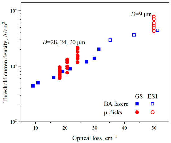 Next, the current densities of the laser thresholds were studied as a function of the microdisk diameter. Several microdisks of each diameter were studied. The obtained data are presented in Figure 4. The observed scatter of the current density can be associated with the influence of the dispersion of microcavity parameters caused by the roughness of the side walls and a possible deviation from the expected size and shape (see also the discussion of the data presented in Figure 6). Nevertheless, the trends on the plot are very distinct.
