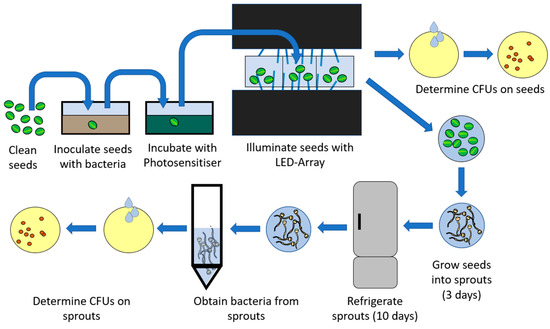 To remove any pre-existing fungal or bacterial contamination of seeds, they were placed in a 50 mL centrifuge tube and disinfected by addition of enough 15% H2O2 (Roth) to submerge the seeds. The seeds were mixed with H2O2 for 1 min (three-seed-species experiment) or 5 min (mung bean-only experiments). Afterwards, H2O2 was carefully aspirated. A single washing step with ddH2O using twice the volume of H2O2 used for initial seed disinfection was performed. As inoculum, 10 mL of a bacterial overnight culture of L. innocua was added into the centrifuge tube, resulting in total seed submersion in the bacterial culture. Afterwards, the liquid phase was carefully discarded. Three contaminated seeds were then transferred into one well of a sterile flat-bottomed 24-well plate. Three wells for each treatment were used, and thus nine seeds per treatment of one species (mung bean, buckwheat, radish). After the addition of 500 µL DPBS containing the respective photosensitiser, the 24-well plates were covered with Aluminium foil to exclude illumination with ambient light. The plates were placed on a shaker (Flow Laboratories, DSG Titertek, microplate shaker) and constantly agitated during the incubation (5 or 30 min). Illumination (10, 20, or 40 min) was provided by two LED arrays (480 diodes of diode type L-7113UVC, Kingbright Electronic Europe GmbH, Issum Germany) with the main emission wavelength at 395 nm. Samples were constantly agitated during illumination with a laboratory shaker. Radiant exposure was measured by using a spectrometer (LI-180, Licor, Li-Cor Biosciences. Lincoln, Nebraska, USA). Using the single-sided LED setup 20 min of illumination resulted in a radiant exposure of 27.8 J/cm2. Ten minutes from the double-sided LED-array illumination setup resulted in 28.2 J/cm2, 20 min in 56.4 J/cm2, and 40 min in 112.9 J/cm2 radiant exposure. After Illumination, the seeds were transferred into 2 mL reaction tubes containing 1 mL DPBS and subsequently shaken. This mixture was the basis for serial dilution in DPBS. If the PS/DPBS solution without the seed in the well was analysed, the remaining solution in the wells was the basis for the dilution series (visible by the prefix supernatant). Counting of colony forming units (CFU) on agar plates was performed after incubation for 48 h in a Heraeus Typ B 5042 E incubator (Hanau, Germany) at 37 °C in the dark. A summary of the workflow can be seen in Figure 1.