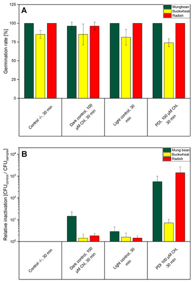 The relative inactivation of Listeria innocua of the 3 seed types (Figure 2B) is 1.1 log step of dark toxicity for mung bean samples. The relative inactivation of the other seeds and controls remained below 0.5 log steps, while the PDI treatment with 100 µM Chl resulted in 2.7, 3.1, and 0.8 log steps reduction on mung bean, radish, and buckwheat seeds, respectively, with the 10 min illumination setup.