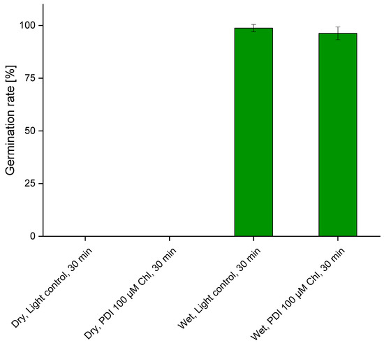 Germination rate [%] of mung bean seeds with reduced contact time to aqueous solutions with one-sided illumination for 20 min resulted in 28.2 J/cm2 radiant exposure. “Dry” indicates the germination rate after treatment, but without the addition of tap water to the seeds. “Wet” samples were the same mung bean seeds as “Dry” of the respective control or PDI-treatment, but the germination rate was assessed after seven days of dry storage and subsequent germination post-watering with 1.1 mL sterile tap water per seed. n = 3. Column height shows the mean. Error bars show the standard deviation.
