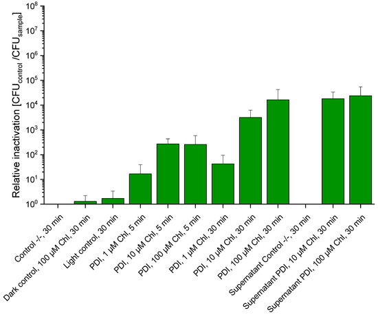 Relative inactivation of L. innocua after PDI treatment of mung bean seeds. One-sided illumination resulted in 27.8 J/cm2. Mean CFUs/mL in Control −/−: 2.3 ∗ 106. The supernatant terminus indicates the relative inactivation of the seedless PS/DPBS supernatant of the respective samples. Column height shows the mean of 5 independent experiments. Error bars show the standard deviation.
