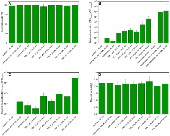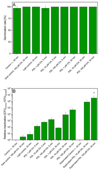 (A) Germination rate [%] of PDI-treated mung bean seeds with a radiant exposure of 112.9 J/cm2. n ≥ 3. (B) Relative inactivation of L. innocua on mung bean seeds after the PDI treatment with a radiant exposure of 112.9 J/cm2. Mean CFUs/mL: 1.27 ∗ 106. Supernatant indicates the relative inactivation of the seedless PS/DPBS supernatant of the respective samples. n ≥ 3. “>” indicates a wipeout. Column height shows the mean. Error bars show the standard deviation.