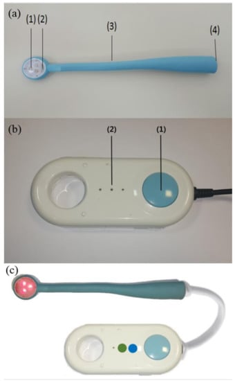 PetalB (Ptech Corp., Pyeongtaek, Republic of Korea). (a) Description of the laser irradiation part of PBMT device. (1) Laser irradiation unit; (2) laser irradiation part cover; (3) silicone handle; (4) main body connect port. (b) Description of the main body of PBMT device. (1) Device operation button; (2) operation indicator lamp. (c) Photos of laser being irradiated by connecting the main body and the laser irradiation part.