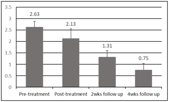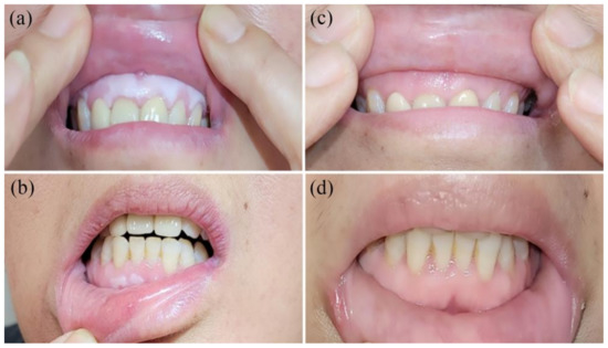 The study included 21 patients with head and neck cancer and moderate-to-severe OM. The baseline characteristics of the patients are listed in Table 3. The patients were Asians (33.3% females and 66.7% males) with a median age of 63.9 (47–93) years. All the patients had OM grade II or III OM before the start of PBMT. The mean value of OM grade decreased significantly from 2.63 ± 0.50 before PBMT to 2.13 ± 0.89, 1.31 ± 0.60 and 0.75 ± 0.58 after treatment, 2 weeks after treatment, and 4 weeks after treatment, respectively (p < 0.05, p < 0.001, and p < 0.001), as shown in Figure 2. The distribution of OM grades before and after PBMT is presented in Table 4. A significant decrease in OM severity was observed after PBMT. The proportion of patients with OM grade 2 (moderate) was 37.5% at baseline, which decreased to 4.8% at the final visit. Additionally, the proportion of patients with OM grade 3 (severe) was 62.5% at baseline; however, no patients with OM grade 3 were observed at the final visit. Clinical pictures of the two patients with marked improvement are shown in Figure 3 and Figure 4.