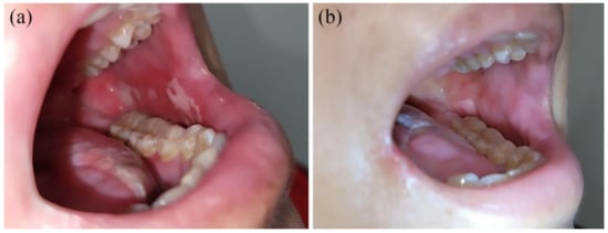 Of the 21 patients enrolled, five dropped out; the reasons for difficulty in visiting the hospital were as follows: two patients found it difficult to visit because of too many treatment sessions, two lived too far from the hospital, and one reported that all OM lesions had healed mid-treatment. No severe side effects or side effects (e.g., mucosal dryness, erythema, pruritus, or desquamation) were reported.