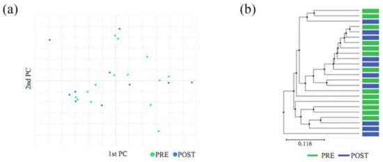 Beta diversity index for the salivary microbiome of cancer patients. (a) UniFrac-based PCoA (principal coordinate analysis) and (b) UPGMA (unweighted pair group method with arithmetic mean) were applied to the beta diversity analysis of the salivary microbiome.