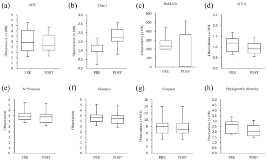 Alpha diversity index for salivary microbiome of cancer patients. Species richness was analyzed based on (a) Ace (b) Chao1, (c) Jacknife, and (d) OTU. Species diversity was analyzed as (e) NPShannon, (f) Shannon, (g) Simpson, and (h) Phylogenetic diversity. The analysis results are presented as a boxplot, with the horizontal black band representing the median value and the upper and lower margins of the boxplot representing the first and third quartiles. No statistically significant differences were detected between the two groups in any of the analyzes used.