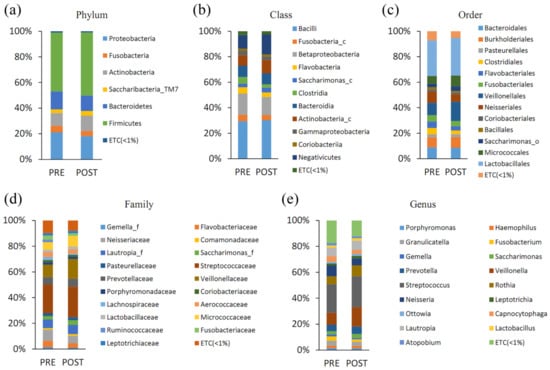 Average taxonomic composition of the salivary microbiome of cancer patients. Taxonomic relative abundance was classified into (a) phylum, (b) class, (c) order, (d,e) genus, and when the relative abundance was less than 1%, it was indicated as ETC. The Wilcoxon rank-sum test was used to analyze the significance between the two groups. For all ranks, none of the taxa with a relative abundance greater than 1% had significant changes.