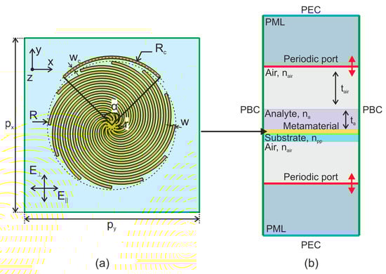 To predict the resonance characteristics of spiral sensors we used the COMSOL Multiphysics software, which enabled the calculation of the metasurfaces by the finite element method. The 2D metamaterial was simulated in the 3D space. An elementary Floquet cell consisted of a metal Archimedean spiral with a C-shaped resonator. It was limited by periodic boundary conditions on its four sides for the calculation of an infinite 2D array as shown in Figure 1b. The Al metal layer was modeled as a transition boundary condition with the electrical conductivity S/m [37,38] and thickness μm. A thin layer of analyte was calculated as a conventional domain, but a structured mesh was used for modeling it.