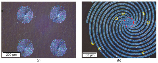 - A circle with small ellipticity appears in the center of each spiral structure because of the limitation of the fabrication process (the red ring in Figure 2b).