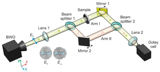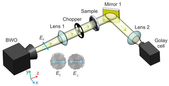 We measured the amplitude spectra of a wave transmitted through the optical system shown in Figure 3. The conical wavefront of a TM-polarized wave of the BWO was collimated by a polyethylene lens. After that, a diffraction-limited Gaussian beam radiated into the free space and passed through the obturator and the sample. By means of a mirror and a lens, it was directed to a Golay cell, which was used as a broadband THz detector in combination with a lock-in amplifier. The experimental parameter was defined as the ratio of the intensity of the beam transmitted through the sample to the intensity of the beam passed through the experimental scheme without the sample: