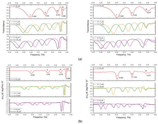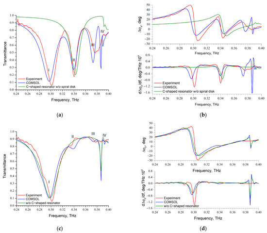 We first compared the amplitude, phase, and absolute gradient of the phase change spectra of the spiral metamaterial without analyte for the two polarization states obtained from the experiments and COMSOL simulations, as shown in Figure 5. The phase change was found via Equation (6), whereas the absolute gradient of the phase change was determined as . We excited four modes with a -polarized wave due to the C-resonator (Figure 5a). The first mode (I) emerged at 0.297 THz and 0.302 THz in the experiments and the simulations, correspondingly. Since the same resonance was observed with a -polarized beam and was excited on the structure without a C-shaped resonator (Figure 5c), we can conclude that those were the fundamental modes. For the explanation of the following dip occurring at 0.34 THz (II), we calculated the phase and transmission spectra of a C-shaped resonator without a spiral disk, as can be seen in Figure 5a. The resonance position of this structure was close (0.343 THz) to the second dip. Thus, the resonance (II) comes from the LSP mode supported by the single C-shaped resonator, and it is a hybrid mode. The third dip emerged at 0.373 THz (III) and corresponded to the dark dipole mode. The narrowest resonances (IV) at 0.388 THz were the diffraction modes for both polarizations.