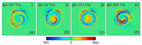 The vertical electric fields of the metamaterial were collected at the resonant dip frequencies for illustration of the resonant physical mechanism in resonant modes excited by . The distributions of the electric field are shown in Figure 6. The low-frequency resonance mode (Figure 6a) at THz corresponds to the fundamental mode that can be excited without any C-resonator. The minimum and maximum of the electric field concentrate on the different sides of the spiral structure, forming the electric dipole resonance. Adding C-resonator enables the excitation of additional modes. Figure 6b,c depict the electric fields of the metamaterial structure at two resonant frequencies ( THz and THz), which maxima vary along the radial direction. Thus, we can conclude that these two resonances are magnetic dipole resonances. Besides, the resonance f2 is very close to the fundamental mode of the C-resonator, which correspond to hybridized nature of f2. The position of the fourth resonance is determined via Equation (3), which is the diffraction resonance mode at THz.