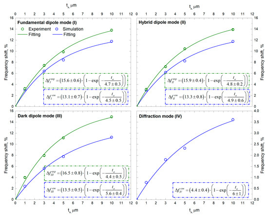 To obtain further insight into the resonances capabilities of the spiral structure, we defined the frequency shift as , where is the resonance frequency of the spiral metamaterial coated with an analyte with thickness , and is the resonance frequency of the metamaterial without any analyte coating. We plotted the measured and simulated frequency shifts of the spiral metamaterials in Figure 8. The fitting function can be described as , where is the saturation frequency shift and is the saturation thickness of the sensor. We fitted the simulation and experimental results, and the good match of this approximation with the data indicates that the boundary fields exponentially decayed from the top surface of the sensor. Meanwhile, the experimental data show a systematic deviation from the simulation results. This is due to the fluctuations in the refractive index of the analyte over time, as was described in Section 4.