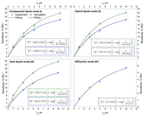 The fundamental and dark resonance modes are dipole modes, but they work at different frequencies; within the observational error, they have the same sensitivities. We estimated the sensitivities of the dipole modes as %/RIU for the modeling results. As was mentioned earlier, the refractive index of the analyte differed from the simulated value. It is possible to estimate the experimental refractive index of the analyte based on the measurements. Assuming that , we obtain , and then the experimental sensitivity is %/RIU.