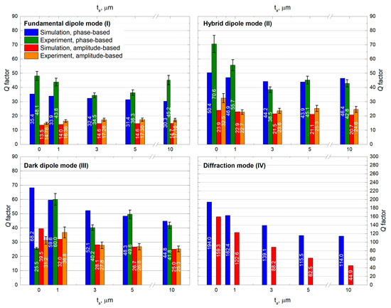 In the amplitude measurements, the best Q factor was observed for the dipole modes excited with the C-shaped resonator; it was for the modeling and for the experimental results, whereas for the fundamental dipole mode, it was and , correspondingly. The Q factor of the hybrid dipole mode at 0.34 THz was better in the experiment because it was clearly distinguishable. In terms of this parameter, the dark dipole mode is almost three times better than the fundamental mode. To compare the quality factor obtained from the phase measurement, almost twice the best quality factor is shown. So, the results were , , , and . Increasing the quality factor is the main reason for using phase measurements for dark dipole modes in sensor applications.