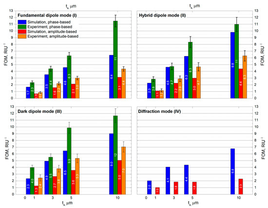 For a further quantitative description of the proposed sensor, we calculated the figure of merit (FOM), which is regularly used for comparison of the sensing performance of the sensor in different frequency bands. Higher FOM values correspond to better sensing performance. We defined the FOM as , where is the quality factor of the resonance of the bare metamaterial. The results are demonstrated in Figure 11. The FOM goes up with increasing analyte thickness because this parameter is inversely proportional to the sensitivity. We can estimate the maximum FOM as . For the amplitude and phase measurements, they were RIU−1 and RIU−1 correspondingly.
