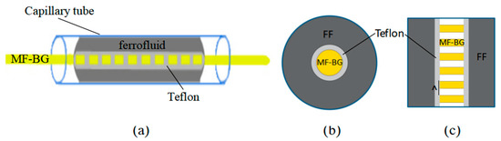Bragg gratings have been widely applied in the rapidly growing field of optical sensors [15,16,17,18]. As one of most popular sensing elements fiber Bragg grating (FBG) can measure a series of physical quantities including temperature [19], humidity [20], pressure [21], strain [22], etc. Profiting from the tunable RI of FF, several magnetic field sensors based on different FBG structures, such as normal FBG [23], etched FBG [24], tilted FBG [25,26], phase-shifted FBG [27], tapered FBG [28], and FBG written on a multi-clad fiber [29] have been proposed. However, since FBGs are sensitive to both ambient RI and temperature, this may lead to large cross-sensitivity and cause great errors in measurement. Therefore, removing the temperature instability is a concern associated with the developing FBG-based sensors for magnetic field measurement.